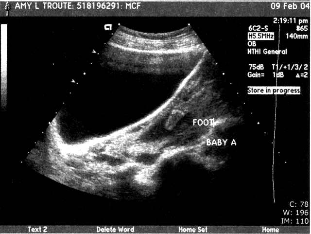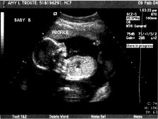 | We had our BIG ultrasound on February 9. Here are a few of the 111 pictures that were taken (everything from areas of the brain to little tiny kidneys) in our nearly 2-hour appointment (click the pictures to get a larger view – note the one where Baby A’s foot is right above Baby B’s head – so cute!!). The babies were moving so much that the tech had to literally hold them down with the ultrasound wand to get the detailed pictures she needed! Talk about uncomfortable!! Whew!! We were thrilled to hear that they’re developing perfectly – measuring in at 14cm and 9oz each!! They even bumped my due date up a week since the babies were measuring bigger than normal – music to our ears!! We’re still shooting for late June… I’d be at 36 weeks on my birthday – I’d love to share June 17 with the twins…or our anniversary June 23, or Father’s Day… ;o) We heard the heartbeats at a doctor’s appointment on 2/18 and my “theory” of their different heart rates signaling “boy and girl” was blown… In each of our past appointments there was a 10-15 beat difference between the two, but this time both were right at 160 beats per minute. I guess Reese is right – I really have no idea who’s in there! This week (2-16 to 2-20) I’ve started to really feel the babies moving! They’re especially active from 2-5 in the afternoon… makes it so hard to concentrate! I love it! I can't imagine how it's going to feel once they weigh more than 9 or 10oz each... Two 4 or 5lb kiddos in there packing on the pounds, rolling around and sticking their feet in each other's faces... Hahaha! What an image!! And the thought of them being most active at night... The adventure is only beginning!" |
