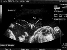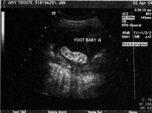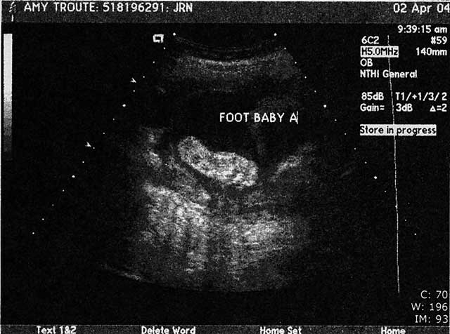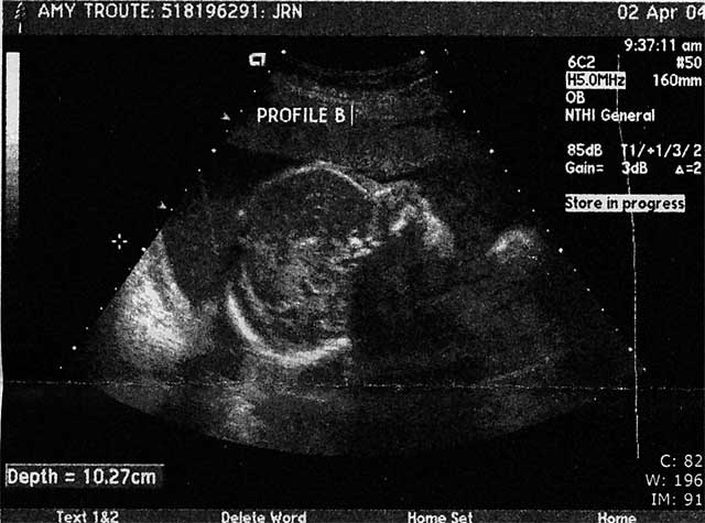 | Troute Twins Update! We had another ultrasound (4-2-04) – this one only lasted an hour and the tech was SO much nicer and better than the last one. It was actually enjoyable!! The babies are doing GREAT – measuring at 26 weeks, 1 day and I’m “technically” only 25 weeks 4 days along (hey – every little bit counts, right?). Baby A is 2lbs 2oz and Baby B is an even 2lbs. :o) they’re kind of in “yin and yang” position now – so cool to finally get a visual on how they’re positioned. Baby A is still the more active of the two – it’s feet are right up at my right rib cage, head down by my bladder and Baby B’s head is just above my belly button and feet are down at my left hip. :o) I can’t stop smiling, can you tell!!? At one point we were able to get face-to-face with Baby B... It was yawning and touching its face cute little lips and nose and chin... I got all teary, Reese grabbed my hand what a moment!! Baby A was facing my back so we didnt get to see its face bummer! Stubborn little thing! Maybe well see its face at next months ultrasound were supposed to have one each month that remains... Yay! 33 week